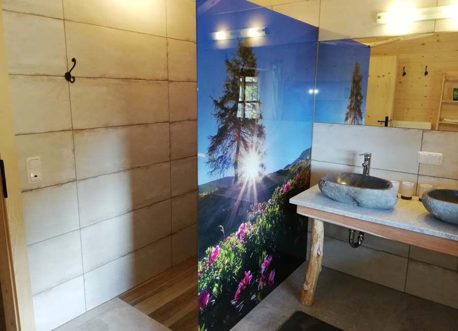 Die Almhütte verfügt über eine gemütliche Stube mit Kachelofen und integrierter Küche, 2 großen Tischen samt Stühlen sowie ein großes Bad mit Doppelwaschtisch, Dusche und WC.